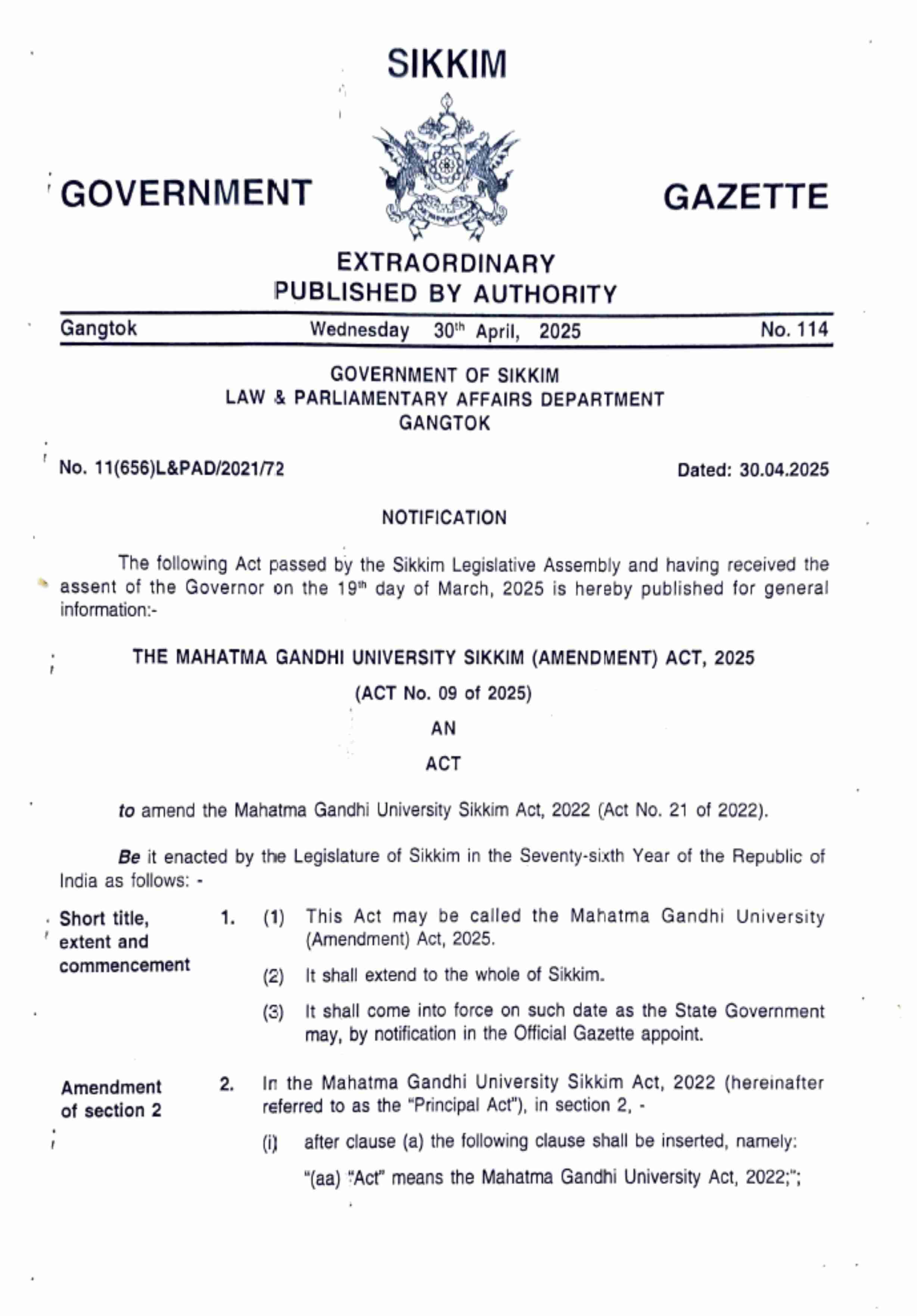 The Mahatma Gandhi University (Amendment) Act, 2025 (“MGU Amendment Act 2025”) is a key legislative enhancement to the original MGU Act 2022. Passed by the State Government of Sikkim in July 2025, this amendment addresses specific regulatory requirements and updates critical provisions to further strengthen the university’s legal framework, align with national educational policies, and enable continued progress and recognition.